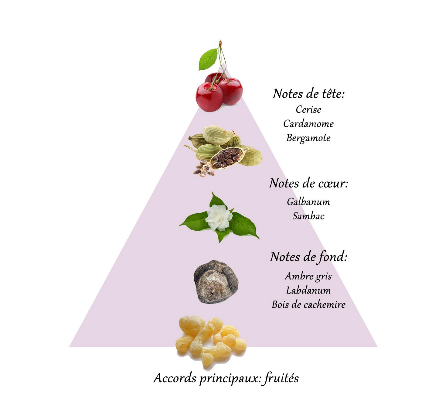 Discover the elegance and tenderness of the fragrance that opens seductive notes of cherry, cardamom, and bergamot. Balance them galbanum, sambac. And leave a unique mark on amber, labdanum, and cashmere wood. The combination has a somewhat mystical effect. It gives lightness, weightlessness, and sensuality.