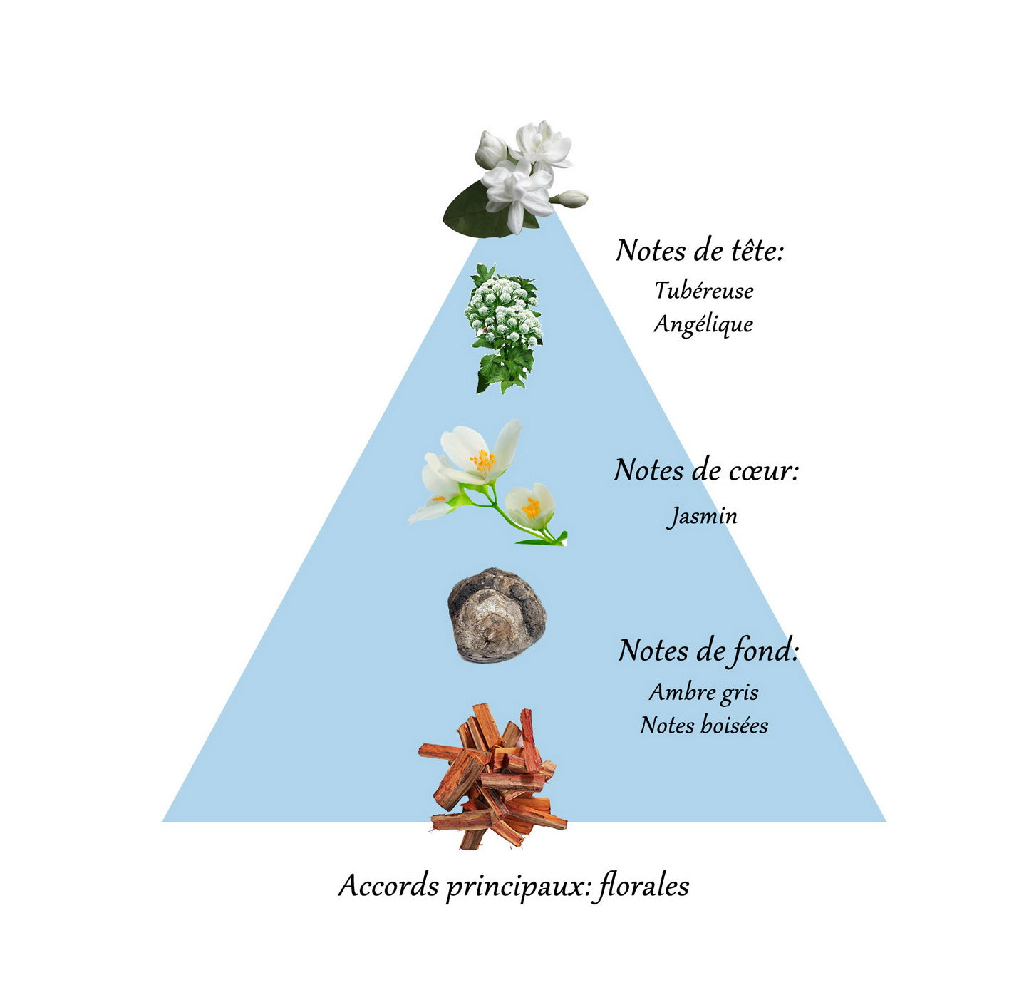 Floral notes represent the exciting aroma of sweetness and charm. The aroma opens with the tenderness of tuberose and angelica. Develops into delicate jasmine, and ends with an elegant aroma of amber and wood.