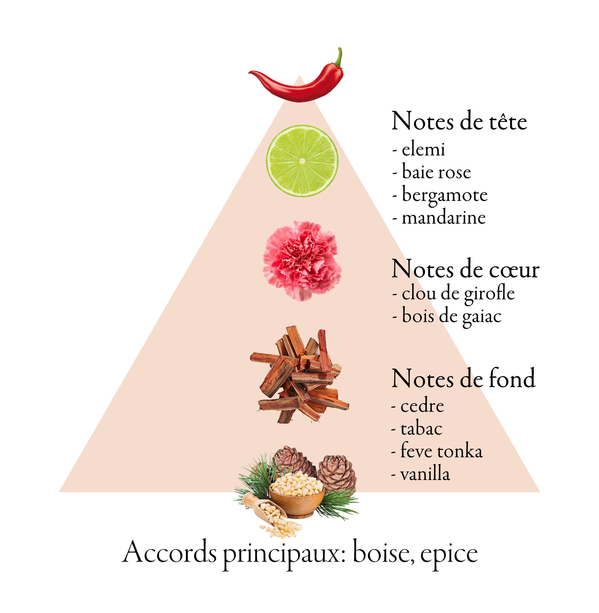 Fragrance group: woody, spicy Top notes: elemi, pink pepper, bergamot, mandarin.