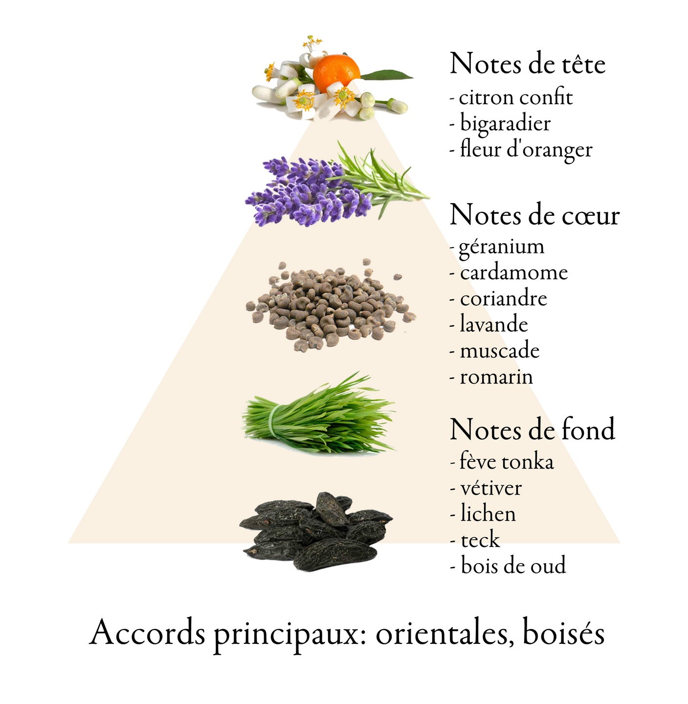 Heart notes: geranium, cardamom, coriander, lavender, nutmeg, rosemary.