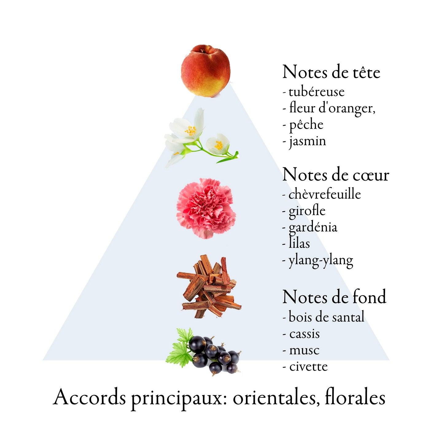 Top notes: tuberose, orange blossom, peach, jasmine.