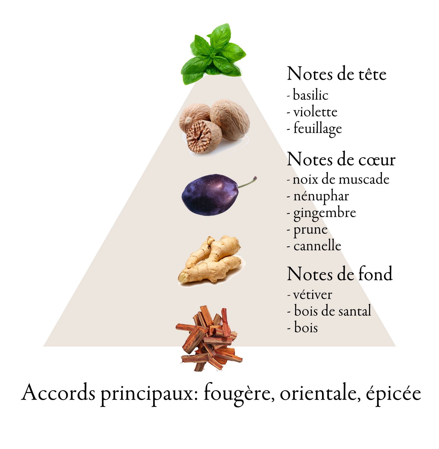 Heart notes: nutmeg, water lily, ginger, plum, cinnamon.