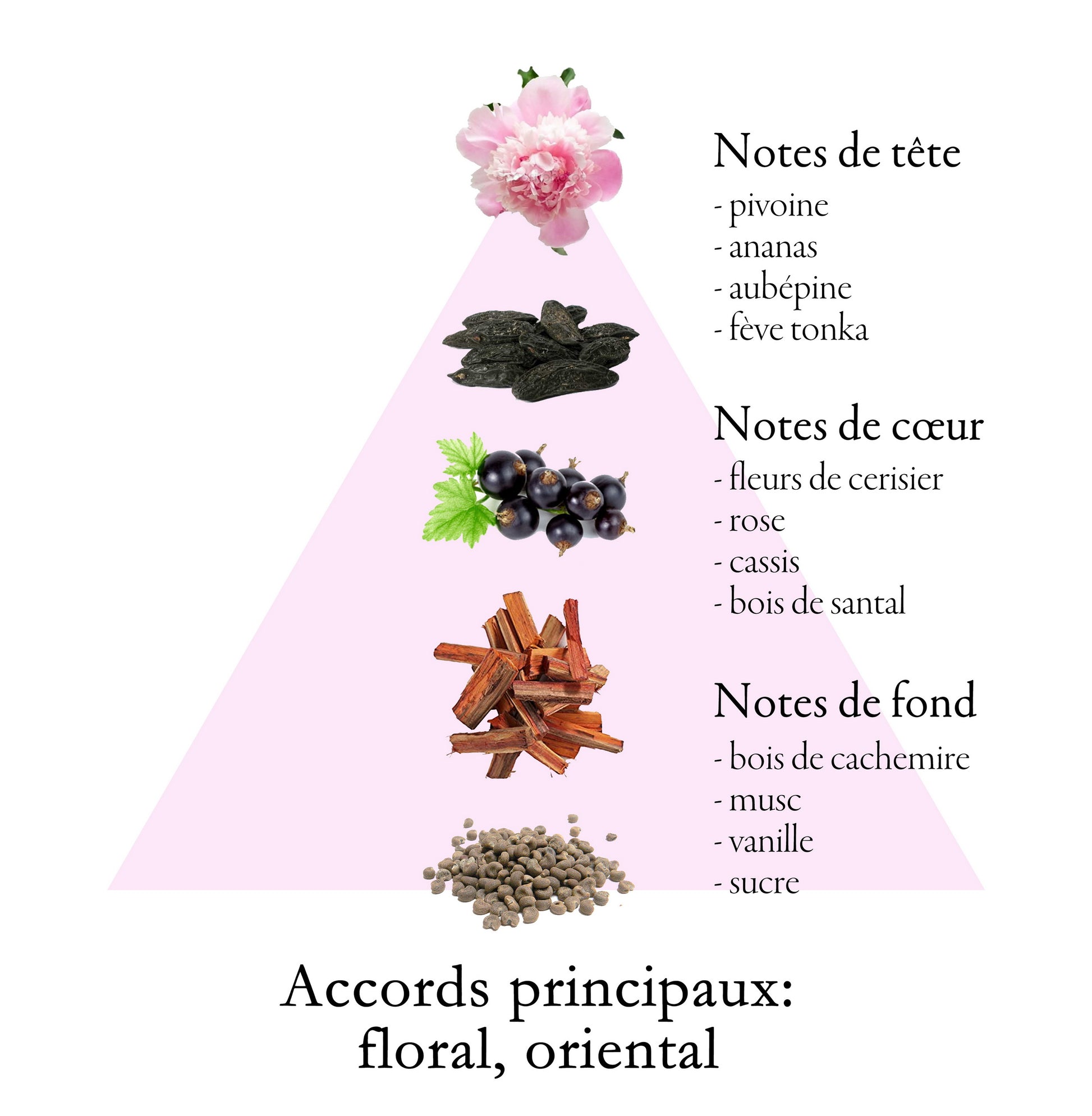 Heart notes: cherry blossom, rose, blackcurrant, sandalwood.