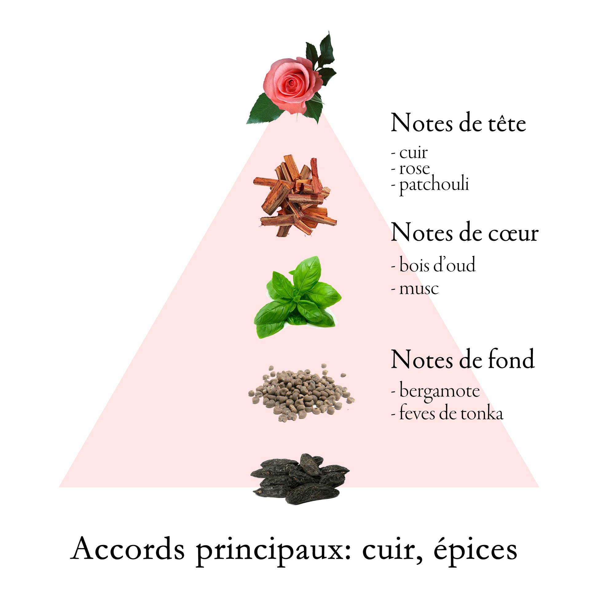 Fragrance group: leather, oriental. Top notes: leather, rose, patchouli.