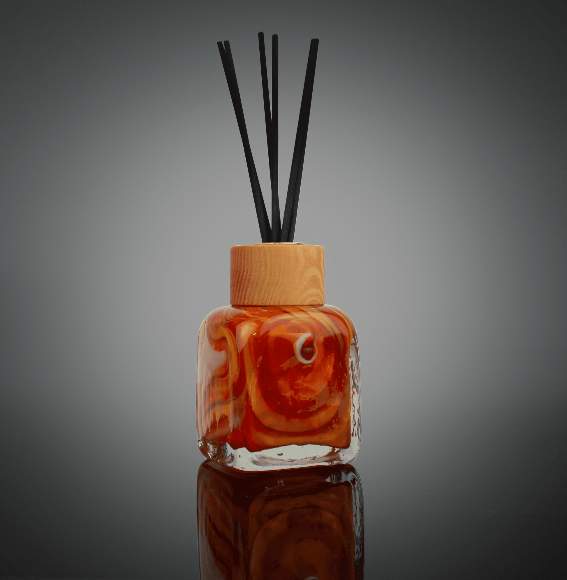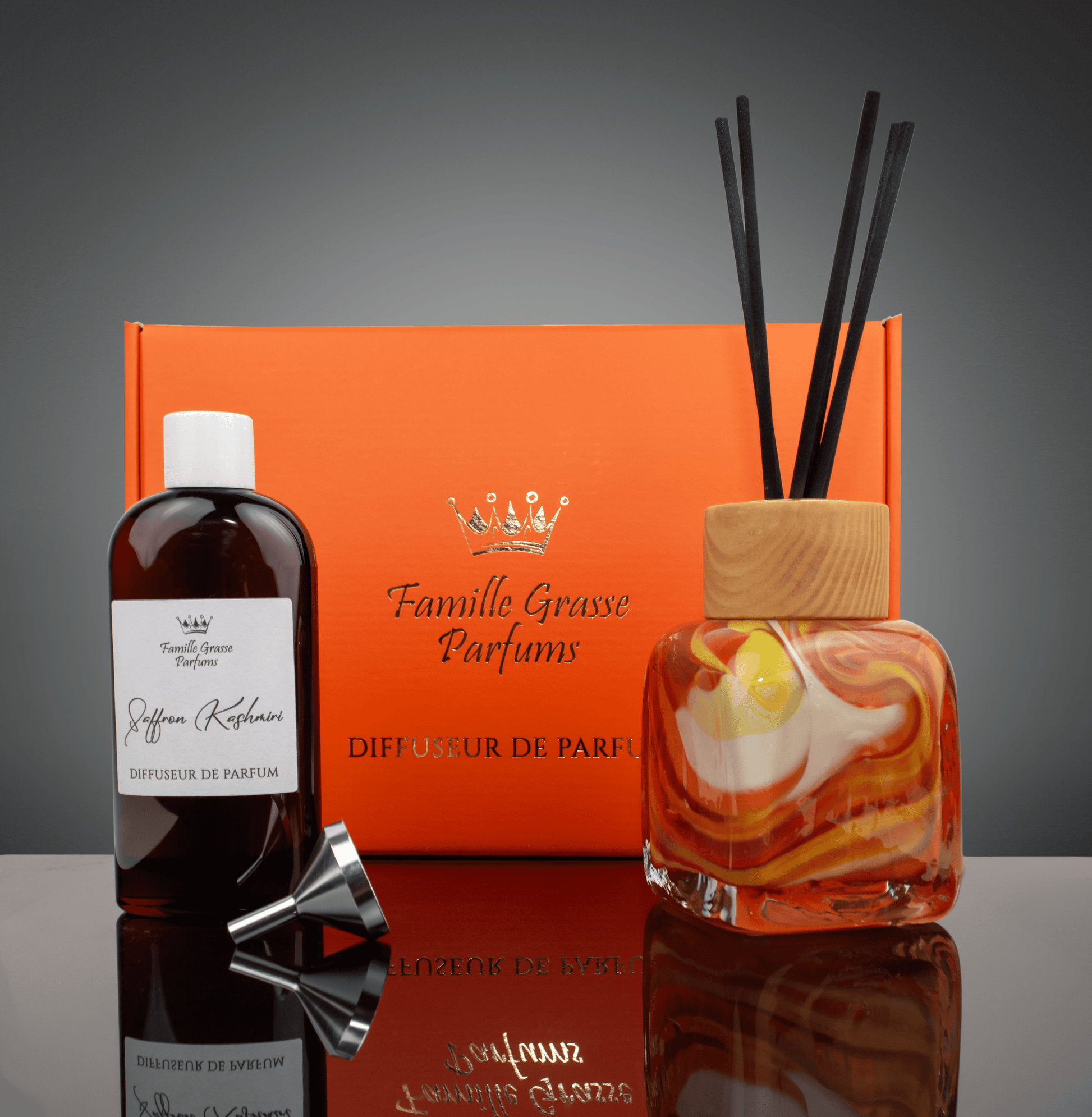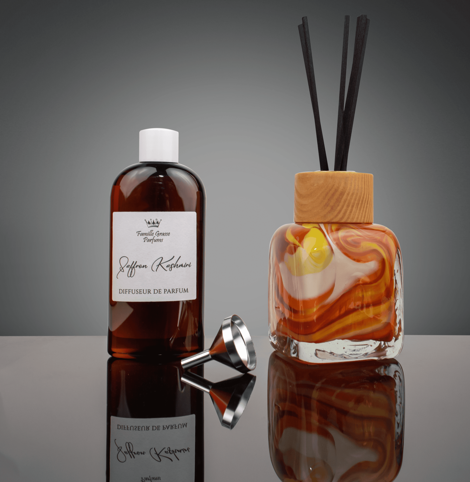 Immerse yourself in ultimate pleasure with the Saffron Kashmiri diffuser. This diffuser spreads the sweet and refined aroma of saffron, creating an atmosphere of calm and elegance in the home. Improves aesthetic perception and adds a touch of luxury. Ideal for creating a relaxing atmosphere after a hard day or for special moments of relaxation.The elegant and stylish look of the diffuser organically fits into any interior. Each bottle for our diffuser is made by hand by a craftsman, so its shape is unique and distinctive.